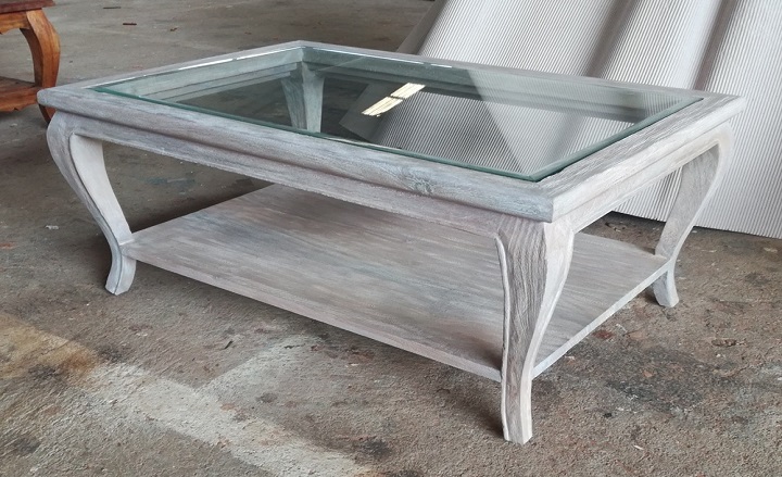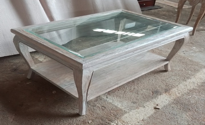 שולחן עץ בהיר דו קומתי עם משטח עליון שקוף
