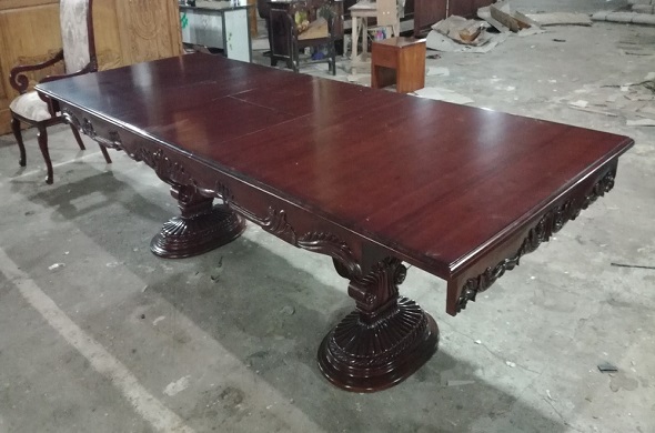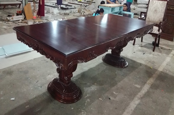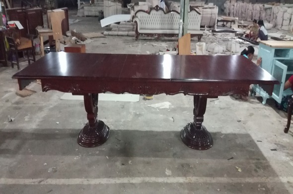 שולחן אוכל מלבני עם שתי רגליים מעוטרות בצבע חום